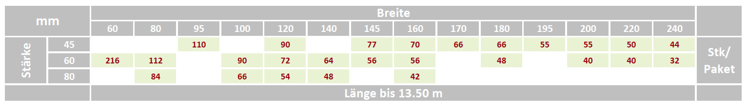 Aufgrund seines Einschnitts und der niedrigen Holzfeuchte neigt es weniger zu Rissbildung, ist formstabil und kommt in der Regel ohne chemischen Holzschutz aus.